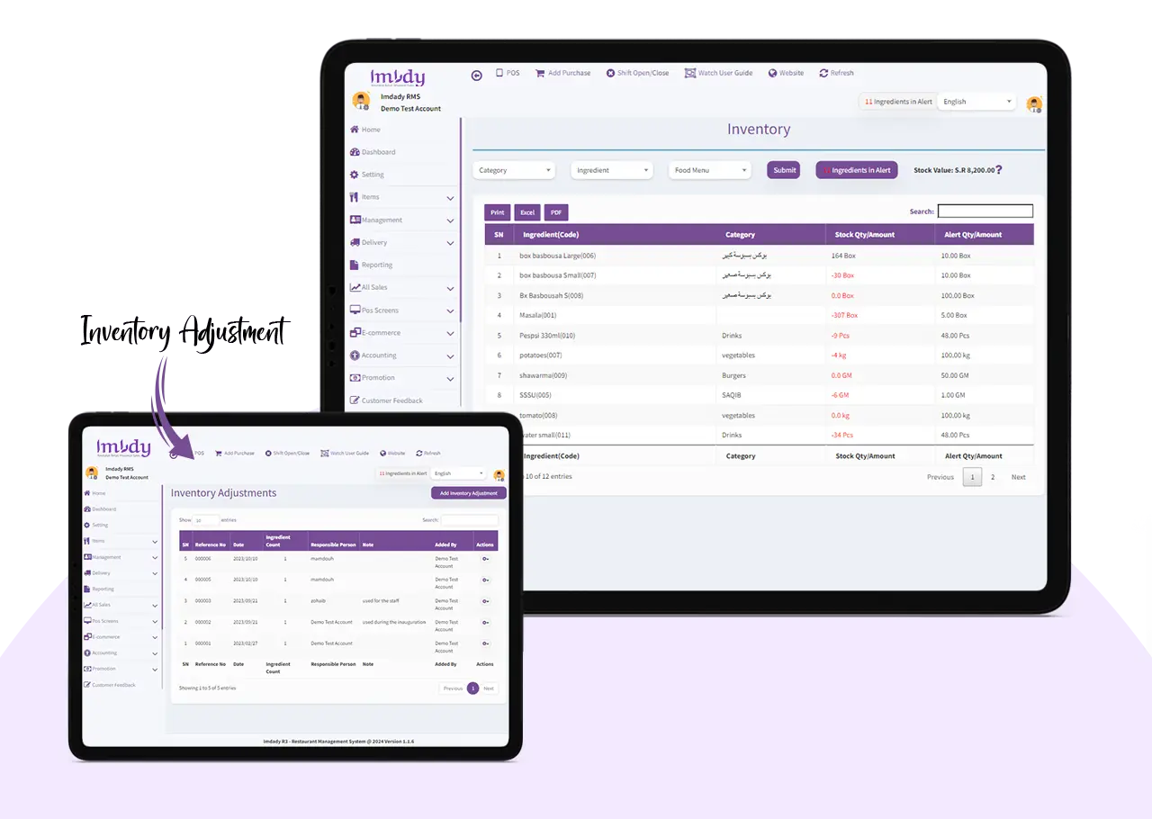 With just a click or tap, you can manage all aspects of inventory — calculate recipe cost, send purchase orders, and transfer stocks with Imdady's own restaurant POS system.